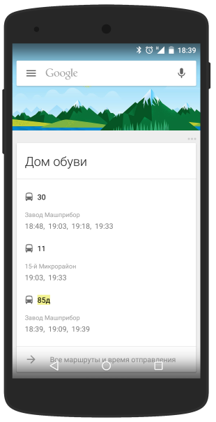 Конечно, это всё удобно и комфортабельно, когда под рукой есть компьютер. Но что, если вы стоите на остановке с одним лишь телефоном под рукой и яро желаете узнать, когда приедет нужный автобус? А, просто откройте Google Now! Он автоматически покажет все маршруты для вашей остановки и даже постарается предугадать ваш пункт назначения:
