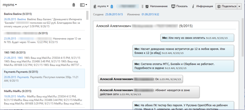 Вот так выглядят мои СМС-сообщения в Evernote: