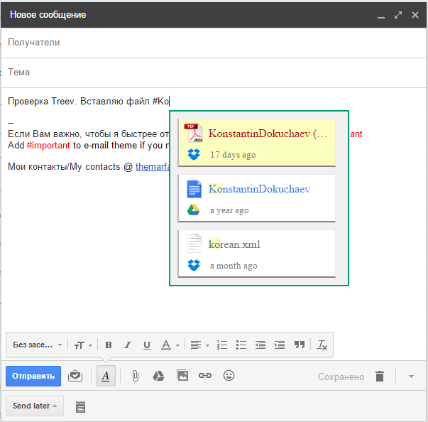 Treev позволяет в реальном времени добавлять файлы из Dropbox или Google Drive прямо в письма. Для этого нужно написать # и начать вводить имя файла. После этого сервис предложит возможные варианты. При клике по файлу он сразу же будет прикреплен к письму.