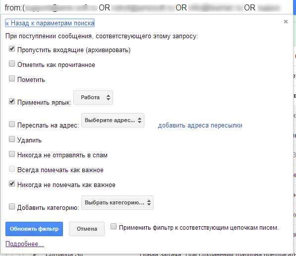 В поле От я указал все рабочие адреса через OR. Далее нужно активировать галочку "Пропустить входящие (архивировать)". Это отключит оповещения на Android или любом другом почтовом клиенте для папки Входящие (Не сортированные). Затем я добавил ярлык, чтобы отделить все письма. И добавил галочку "Никогда не помечать как важное". Затем нам остается только применить фильтр.