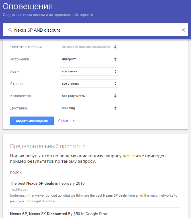 На главной странице сервиса вам сразу же предлагается создать оповещение по нужному вам запросу: