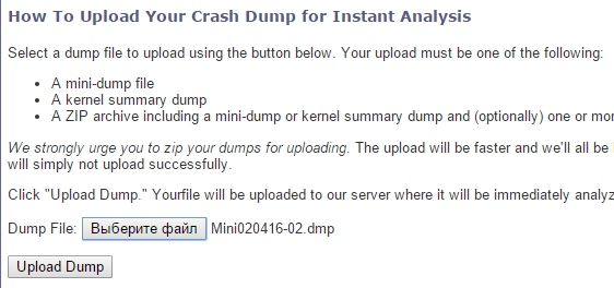 Проанализировать файл дампа онлайн можно при помощи сайта Instant Online Crash Analysis. Просто загрузите файл: