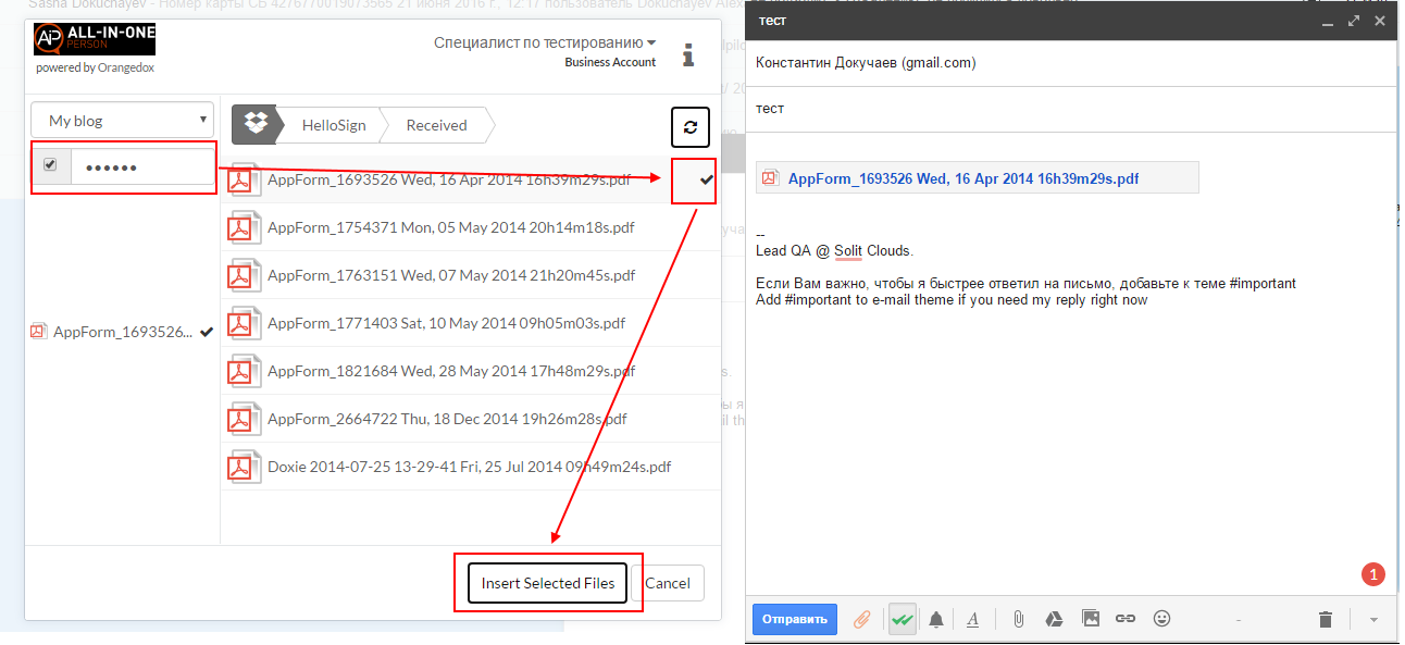 При нажатии на неё появится всплывающее окошко Orangedox, где вы сможете выбрать файлы из Dropbox и сразу же защитить их паролем и добавить к письму. Сам файл при этом будет выглядеть как обычное вложение.