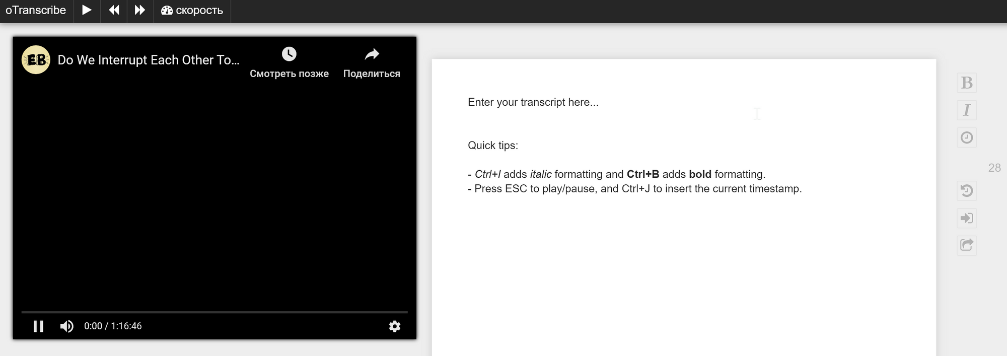 Бесплатный онлайн-сервис для транскрибации аудио. Набор текста и работа с аудио происходит в одном окне. Управление также происходит с помощью горячих клавиш и интерактивных меток. Поддерживаются видеофайлы.