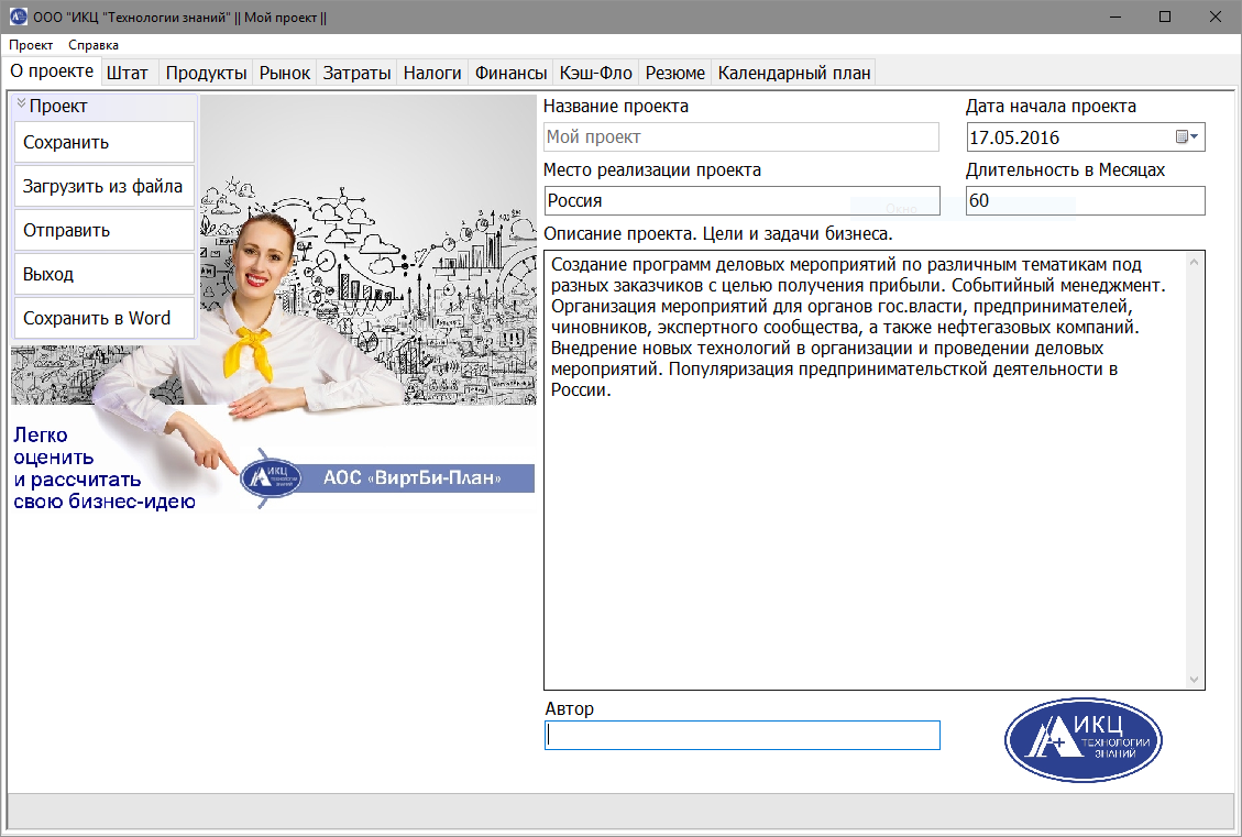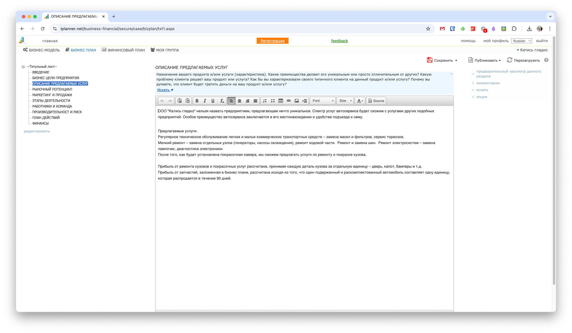 Разработка бизнес-плана ведётся в «личном кабинете», содержащем 85 страниц.