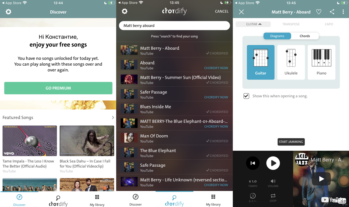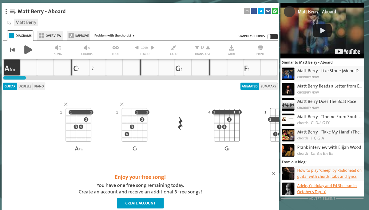 Базовые фишки chordify доступны бесплатно. За 37 рублей в месяц при оплате на год разблокируются платные функции: транспонирование, ограничение на количество треков в день и мобильные приложения.
