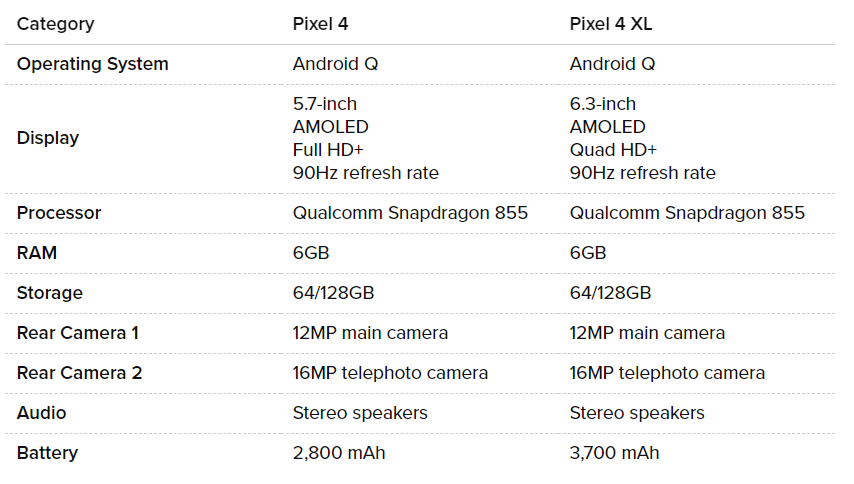 Pixel 4 будет иметь дисплей диагональю 5,7 дюймов, AMOLED экран, Full HD+ и частоту обновления 90 Гц. Батарея 2800 мА·ч.