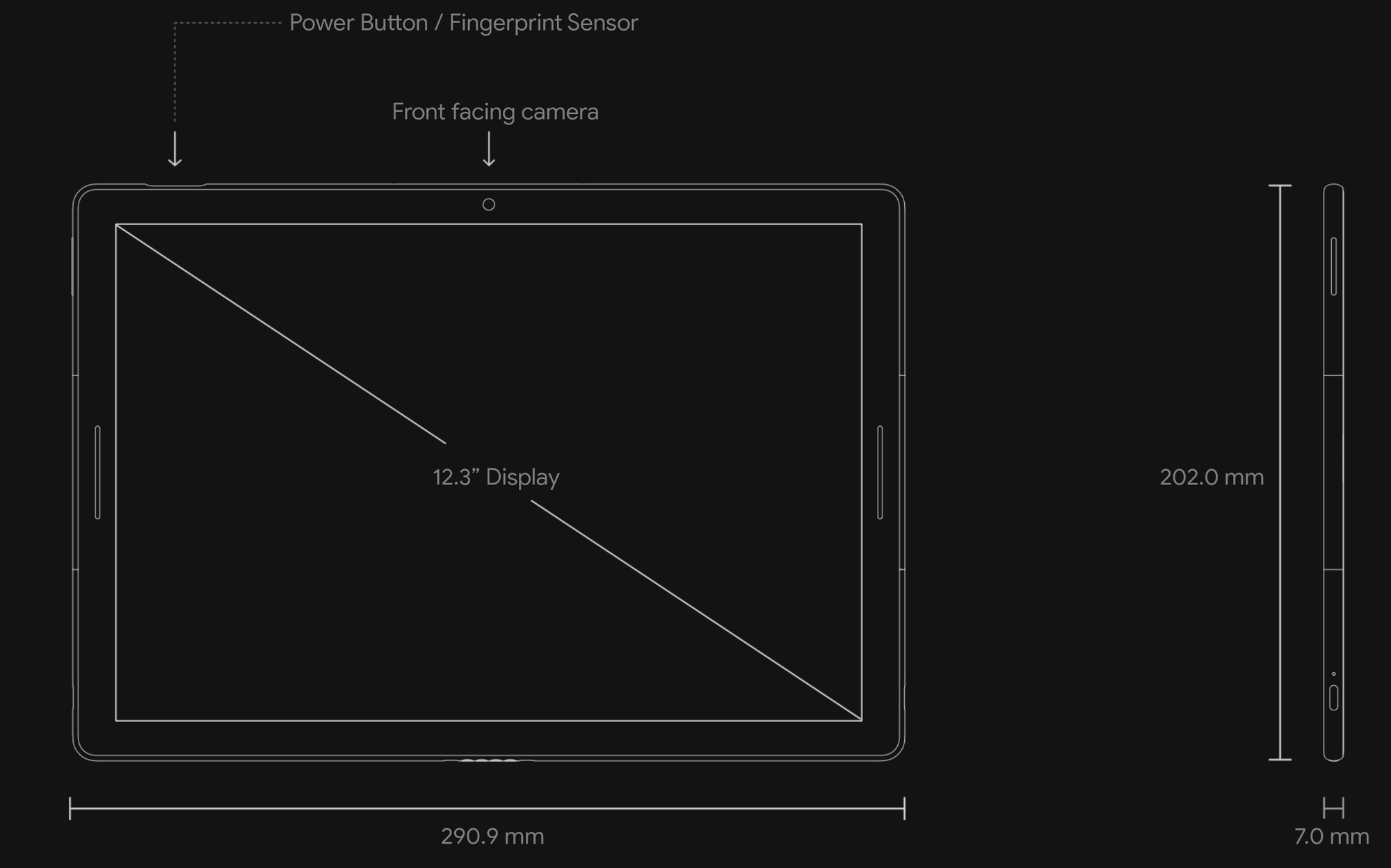 Дисплей везде LCD 12,3 дюйма, 3000x2000 (293 ppi). Фронтальные стереодинамики, два микрофона с шумоподавлением. Цвет только Midnight Blue (чёрно-синий).