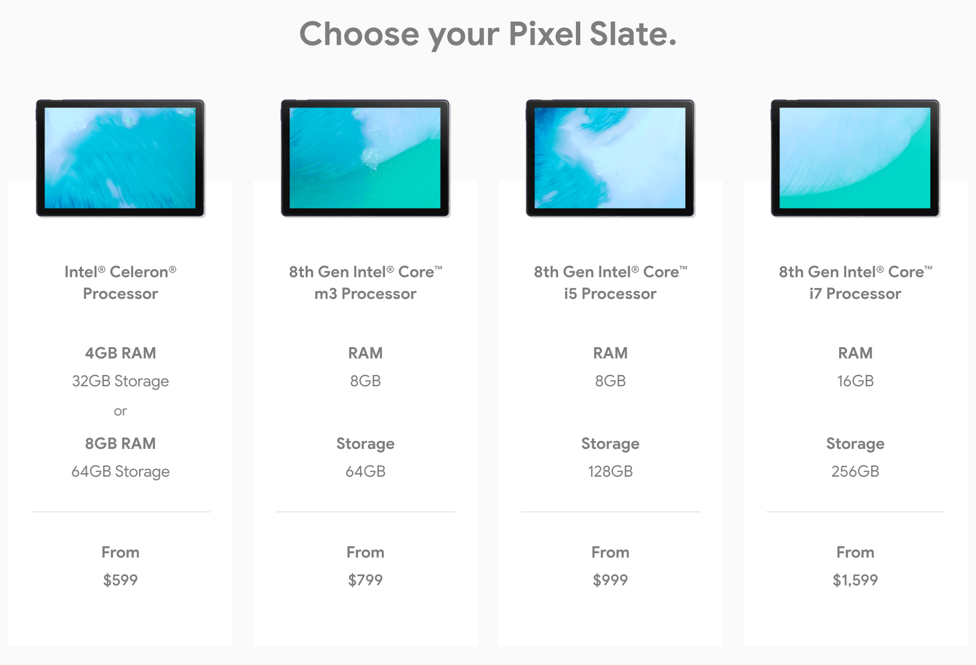 Pixel State поставляется в разных редакциях от $599 и до $1599. Различия не только в объёме памяти, но и в мощности процессора. На самом слабом вас ждёт: 4 Гб оперативки, 32 Гб встроенной памяти и Intel Celeron. На самом мощном: 16 Гб оперативки, 256 Гб встроенной и восьмое поколение Intel i7.