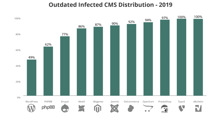 Например, в 2019 году 56% всех приложений CMS на момент их заражения были устаревшими.