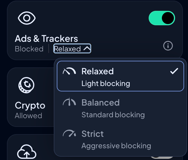 При активации профиля также можно выбрать уровень блокировки — от минимального до очень строгого.