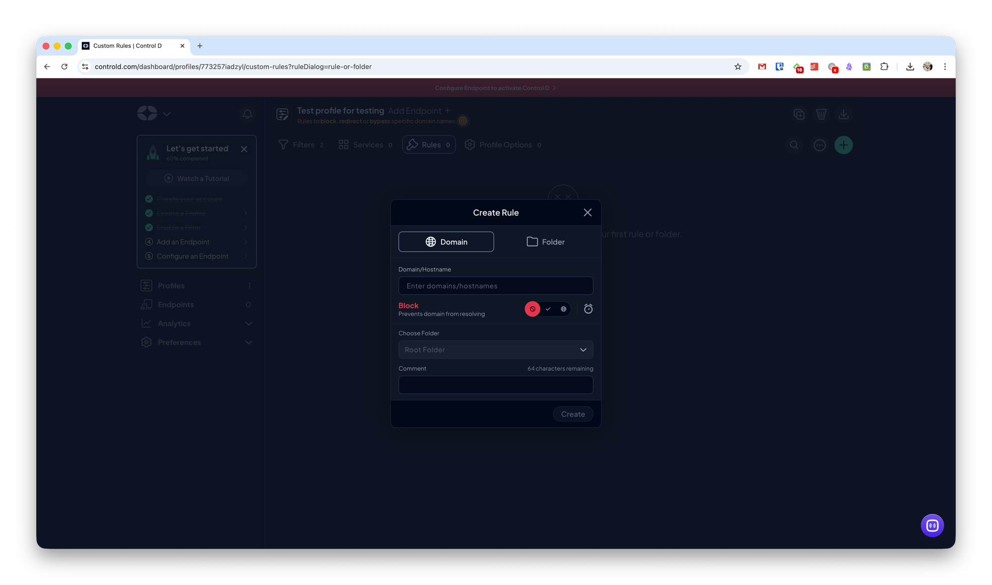 Последний пункт, в котором можно настроить блокировку, — Rules. Здесь вы сами указываете домен для блокировки. Также можно создать папку, и все домены в ней тоже будут заблокированы.