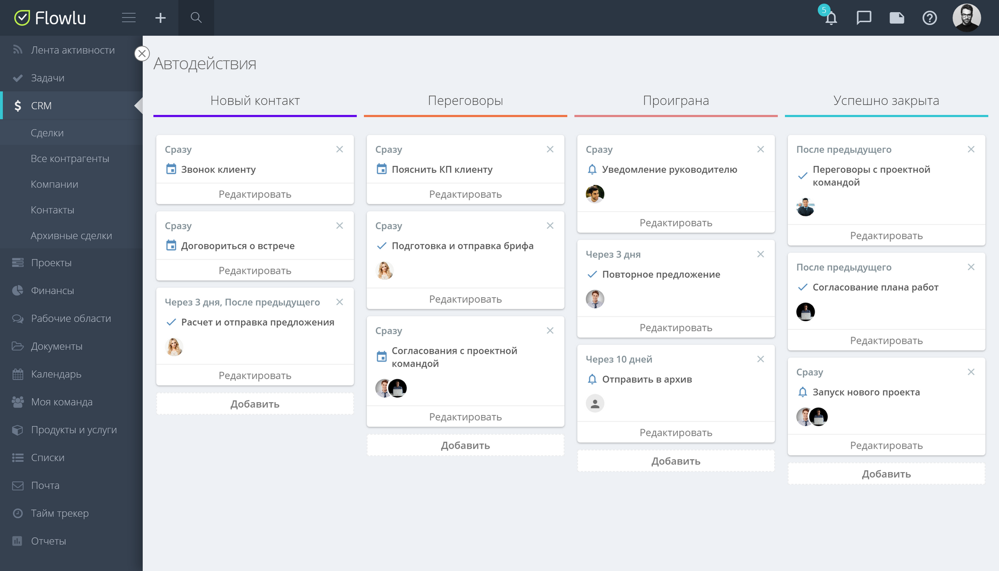 - Создание сценариев для автоматизации однотипных процессов, триггеров для каждой стадии проекта.
