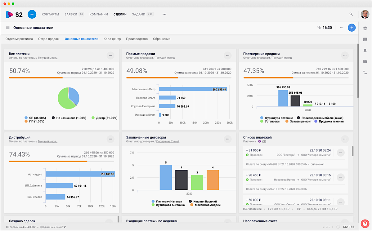 Удобная платформа для построения воронок продаж, управления сотрудниками, проведения конференций по видео, общения в специальной соцсети, общей работы над проектами. ПО подходит для автоматизации работы в офисе, электронных продажах или на производстве.