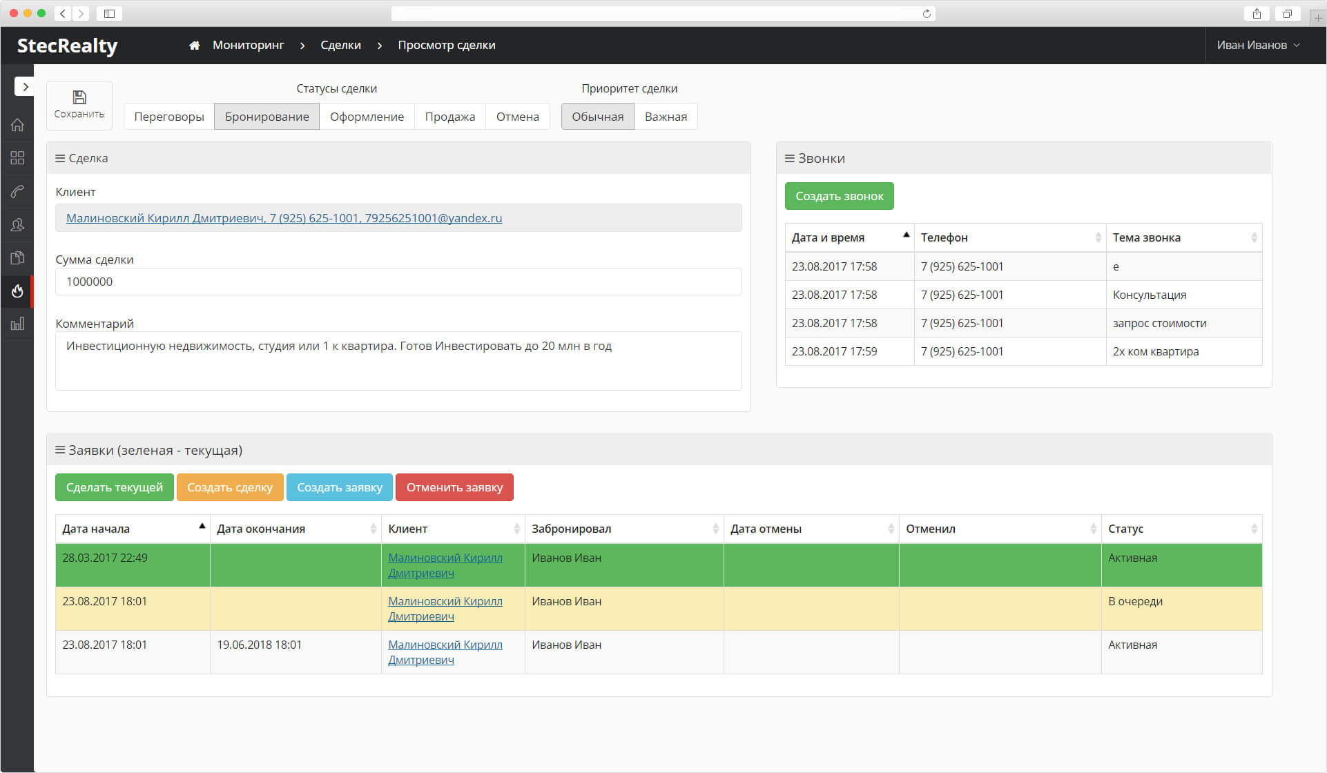- Взаимодействие с мессенджерами и социальными сетями для отправки клиентам сообщений о статусе сделки.