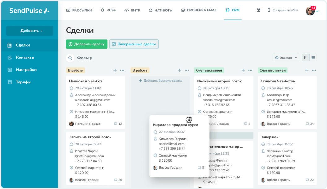 Если вы используете почтовые рассылки или чат-ботов в этом сервисе, можно автоматически создавать сделки после действия в таких рассылках или чатах. К примеру, как только клиент перешёл по ссылке из письма, в системе сразу появится карточка с его данными. К полезным функциям можно отнести и сегментацию сделок и контактных данных посредством тегов.