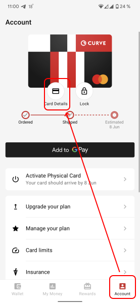 Узнать реквизиты карты Curve можно на вкладке Account по нажатию на кнопку Card Details.