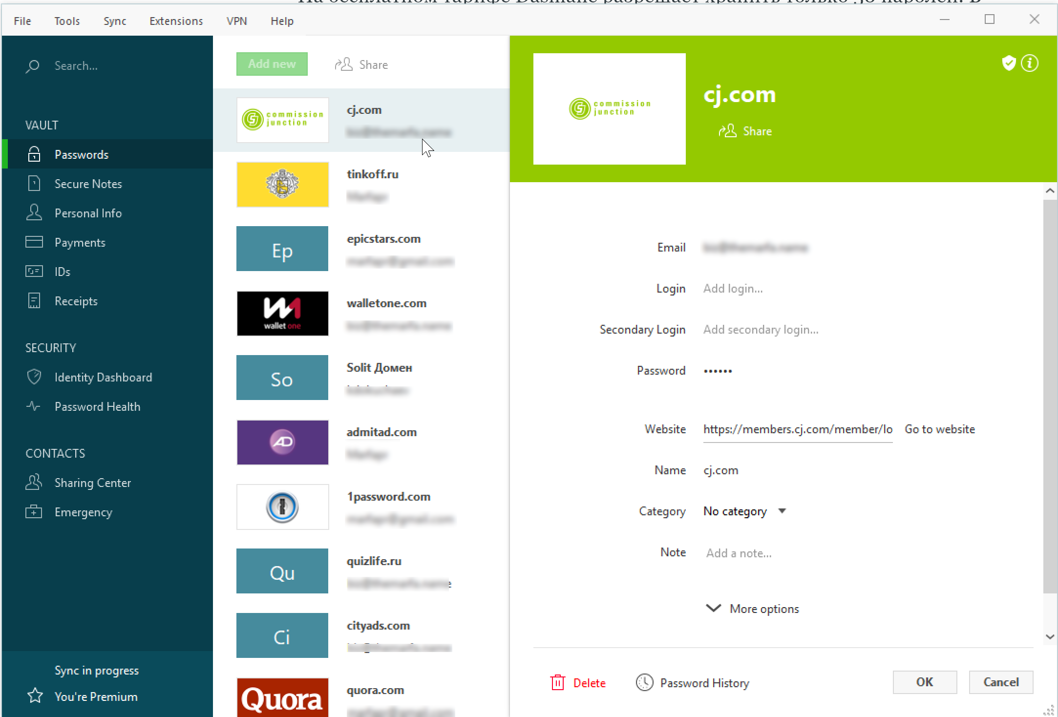 На бесплатном тарифе Dashlane разрешает хранить только 50 паролей. В платной версии никаких ограничений по количеству паролей нет. Кроме этого, в Dashlane можно хранить заметки, банковские карты, удостоверения личности, личную информацию для заполнения полей при оплате и чеки за покупки.