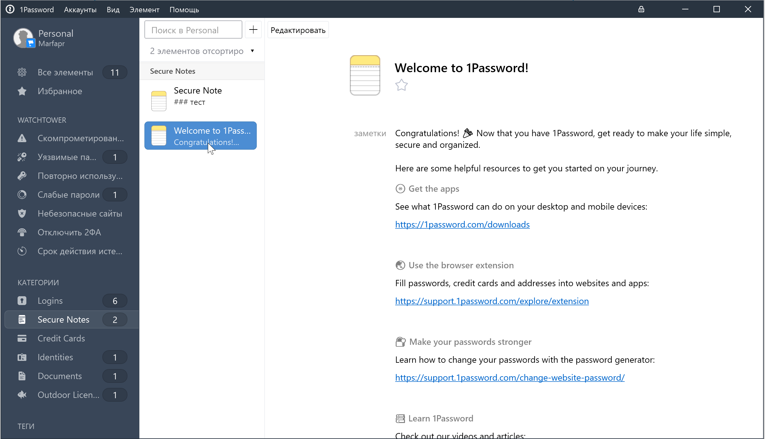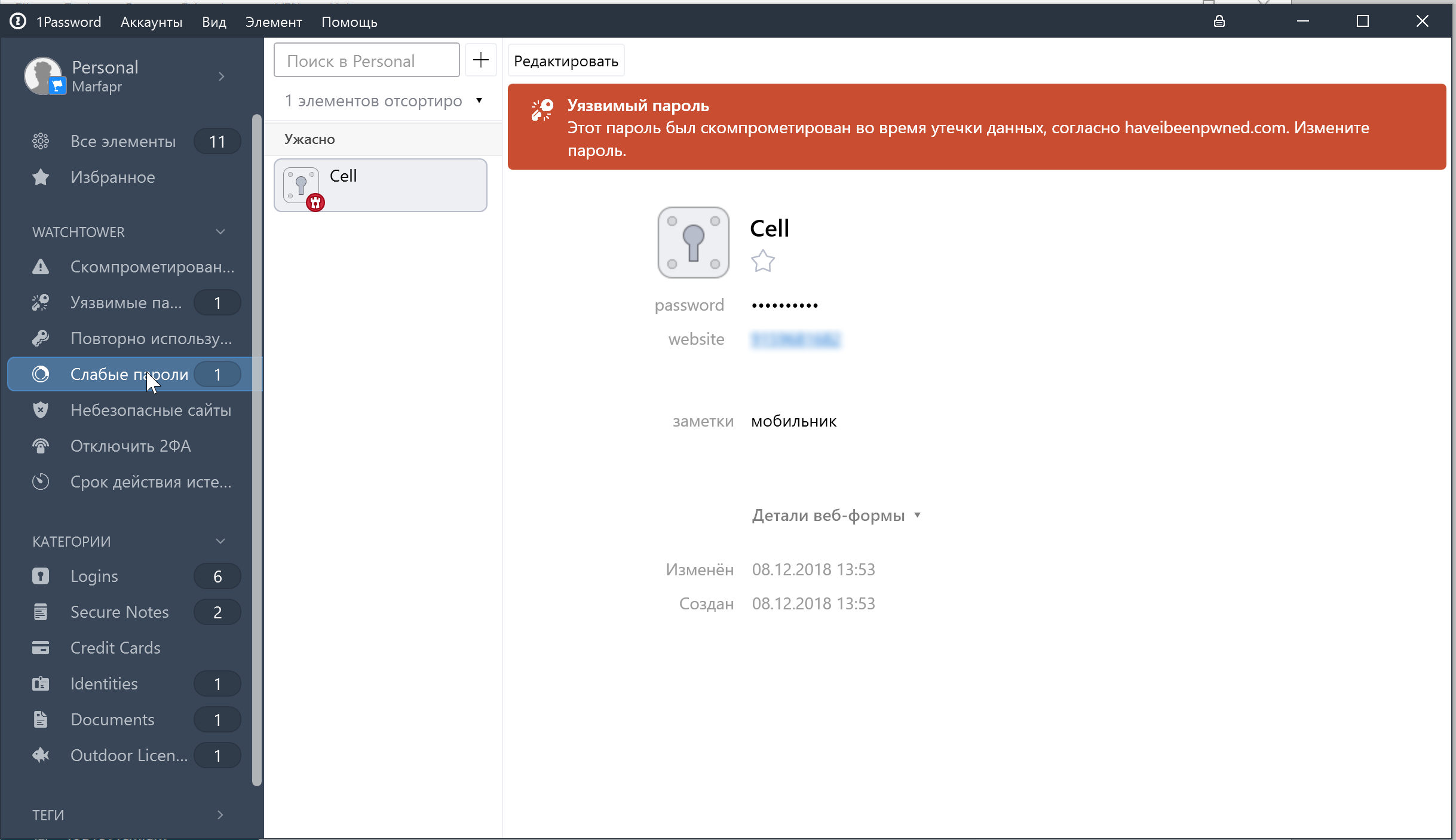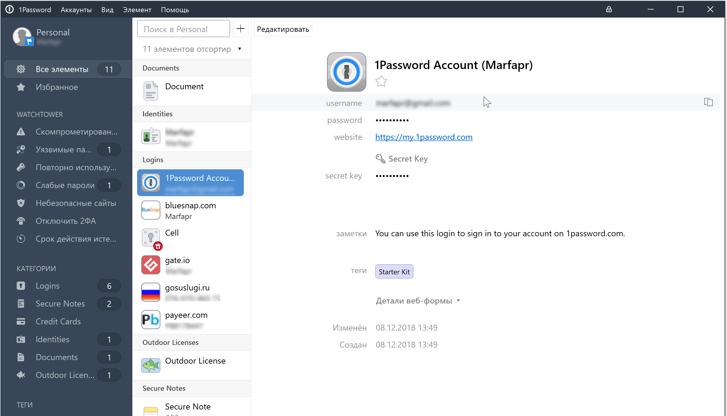 Здесь вся информация хранится в специальном разделе Watchtower. Как и Dashlane, 1Password автоматически следит за утечками данных из используемых сервисов.