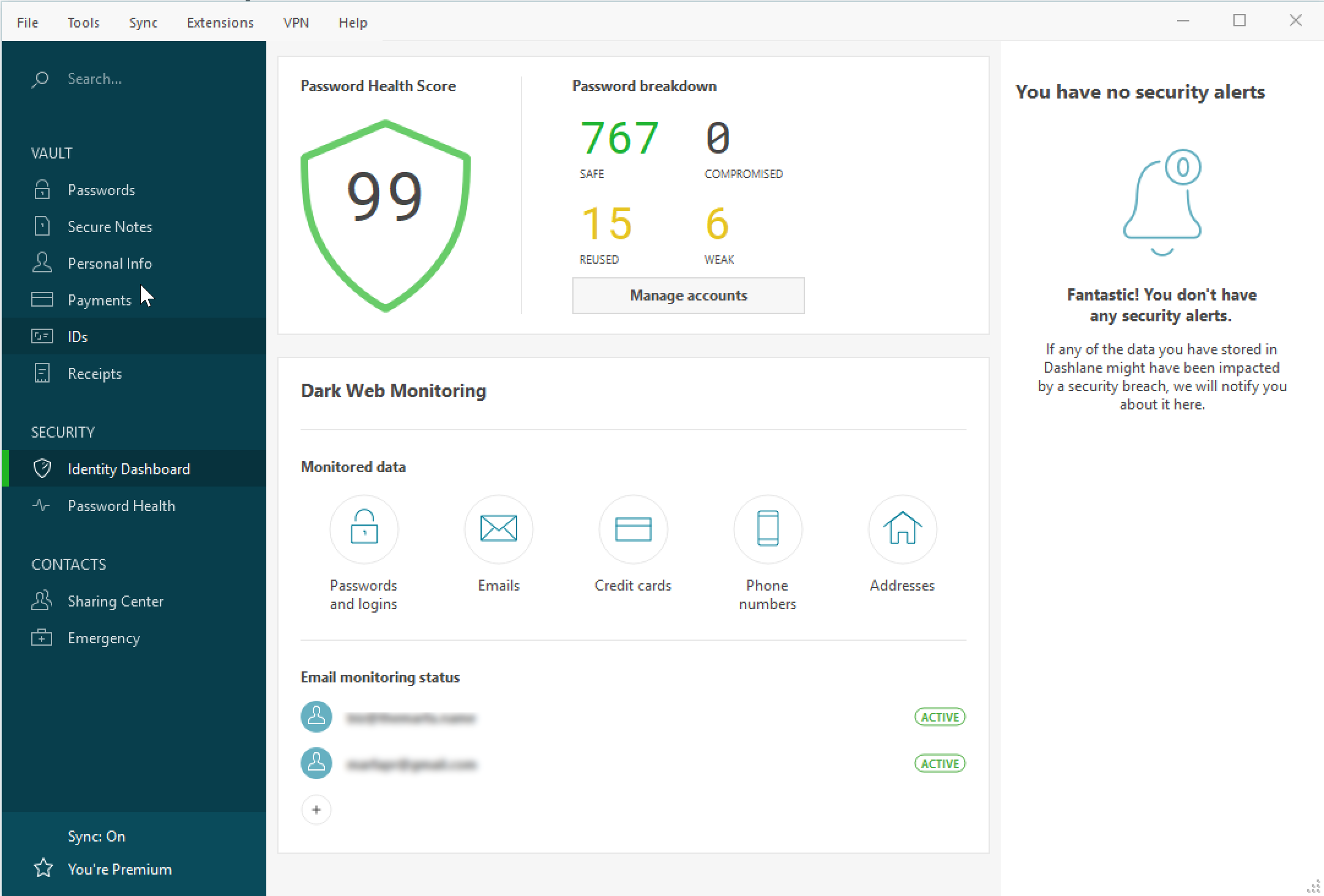Кроме этого, в Dashlane есть встроенный VPN (на базе HotSpot Shield), мониторинг утечек и сложности паролей.