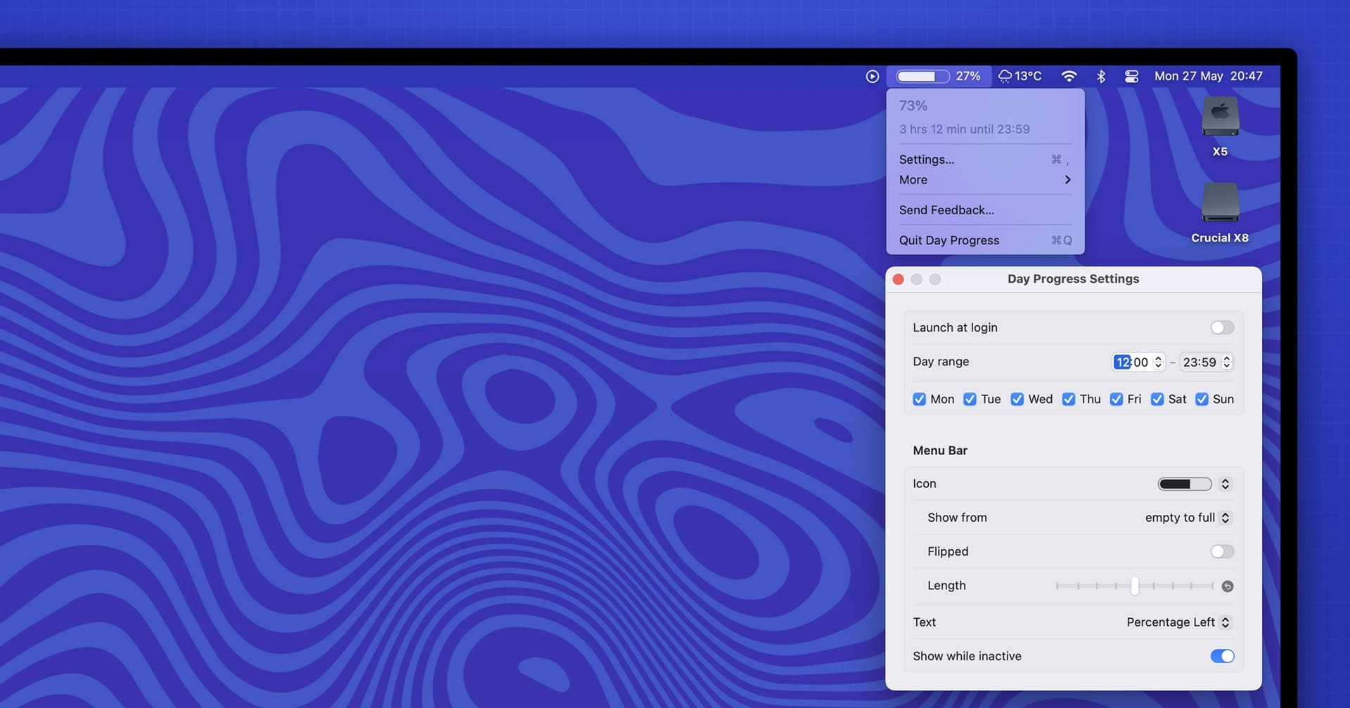В настройках вы можете задать, что вы хотите отслеживать: сколько времени уже прошло или сколько ещё осталось. Также можно установить удобное для вас положение панели и выбрать полосу с закруглёнными углами (если она вам больше нравится).