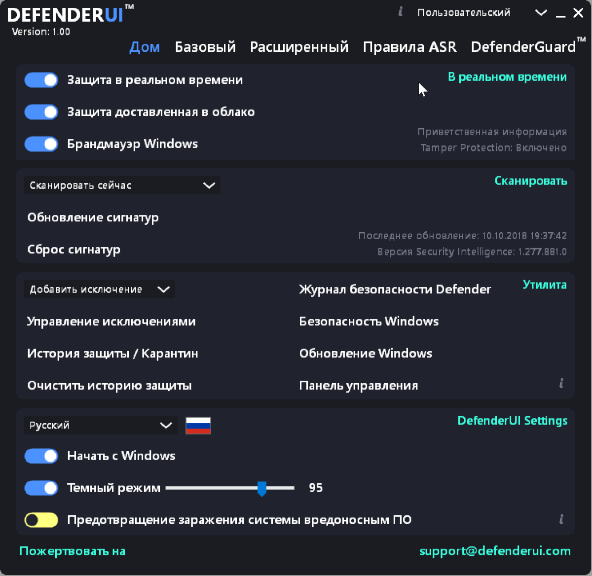 Отсюда же можно настроить поведение самого DefenderUI: запуск при старте системы, язык и прочее.