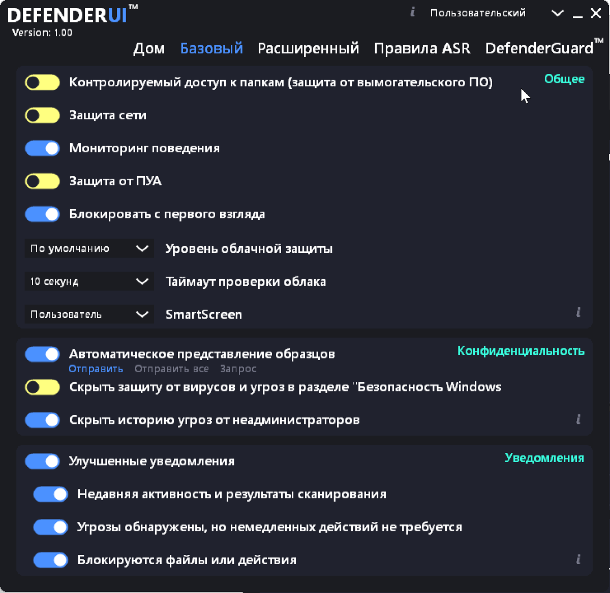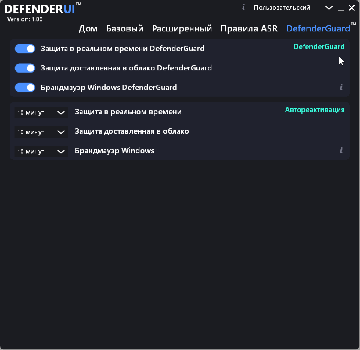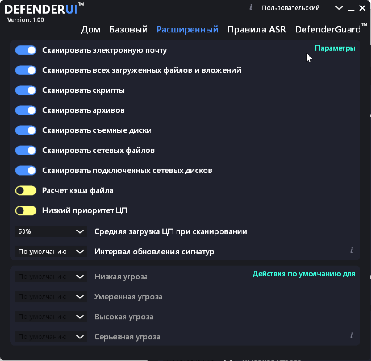 - По умолчанию. Использует дефолтные настройки Windows Defender.