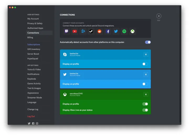 Вы можете подключить к Discord аккаунты сторонних сервисов (Steam, Twitch, Twitter, Spotify, Xbox и пр.). Если хотите, в настройках можете сделать так, чтобы люди не видели ваши учётные записи из других соцсетей.