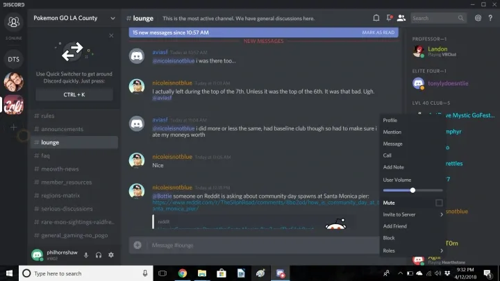 Если вы находитесь с кем-то на одном сервере, это не значит, что вы обязаны его слышать и читать. Кликните правой кнопкой мыши по имени пользователя в списке серверов, чтобы открыть выпадающее меню с различными действиями, и выберите, что хотите сделать. Например, вы можете отправить личное сообщение, добавить пользователя в список друзей, инициировать голосовой вызов, замьютить или заблокировать его. Можно также убавить громкость голоса слишком горластого пользователя. Дав мута кому-то, вы не будете слышать его, но он по-прежнему будет слышать вас. Блокировать пользователя в голосовом чате — бесполезно, т.к. вы всё равно будете его слышать, а вот в текстовых чатах блокировка поможет скрыть все его сообщения.