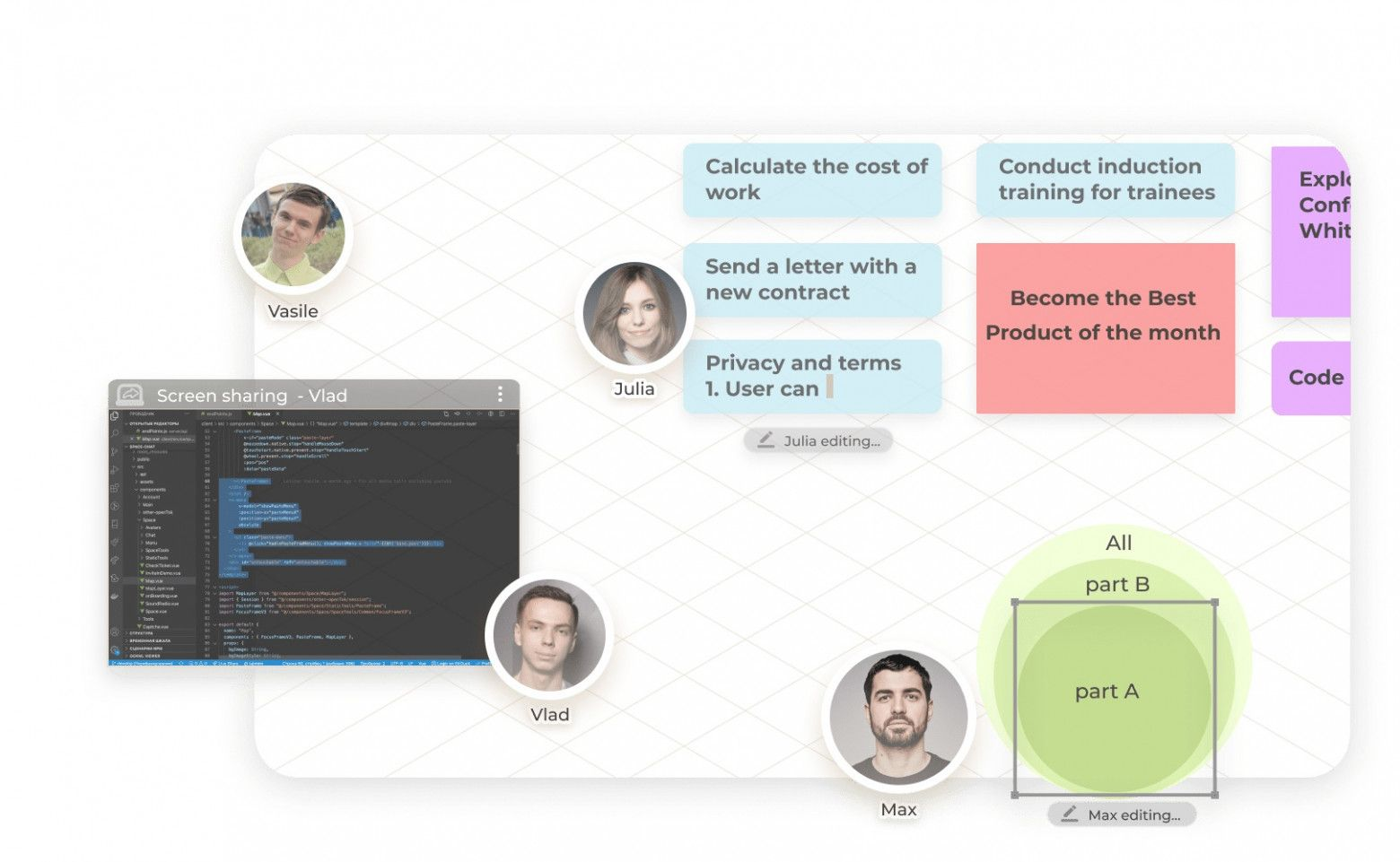 Интерактивная доска, появившаяся в 2023 году и открывающая широкие возможности для командного взаимодействия. Она позволяет решать самые разные задачи, поэтому считается универсальной. Может использоваться для онлайн-конференций и мозговых штурмов, а также в полной мере заменять Скрам-доски.