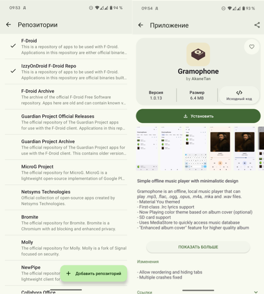 А в настройках Droid-ify можно указать, из каких сторонних магазинов следует тянуть обновления. Сам список достаточно большой и поддерживает все популярные репозитории. Но вот добавить собственный источник не получится.
