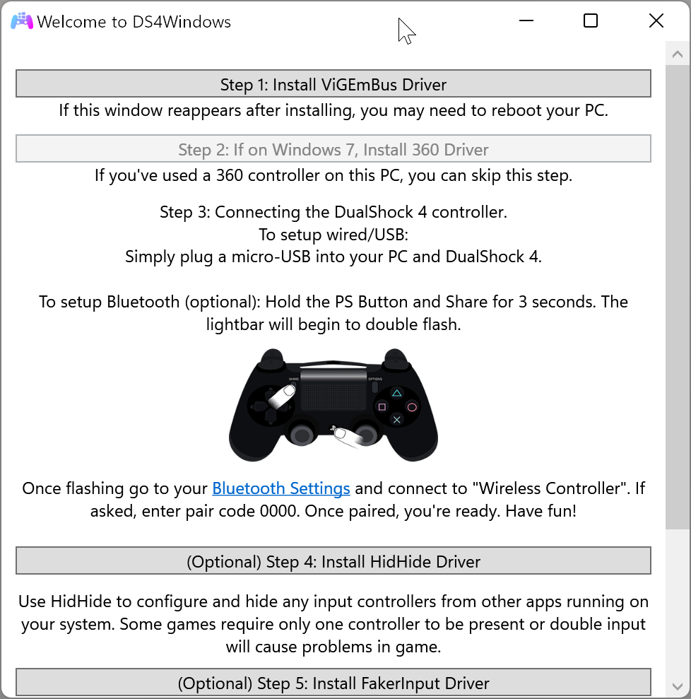 Все пользователи DualShock при попытке подключения их к ПК в первую очередь ставят DS4Windows, которая представляет собой усовершенствованную версию ds4tools.
