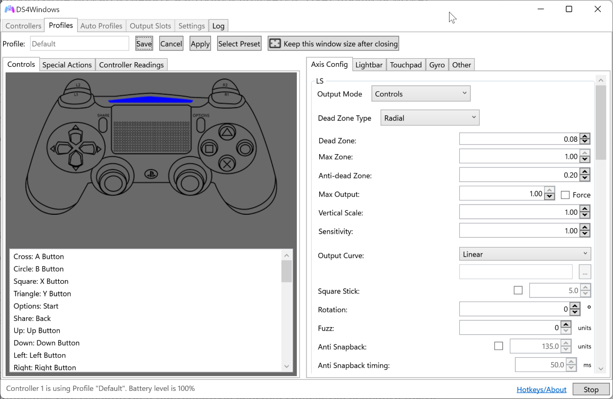 Это основные функции рассматриваемого приложения. Для примера приведём уже созданную и настроенную версию. Подсветка зелёного цвета отображает XBox 360 controller, жёлтого — DualShock v1 с проводным соединением. Подсветка синего цвета работает для профиля, которым можно управлять компьютером на расстоянии, например, с дивана (при этом устройство будет скрыто от системы). Управление курсором на панели находится в выключенном положении для всех профилей, исключение составляет только синий профиль.