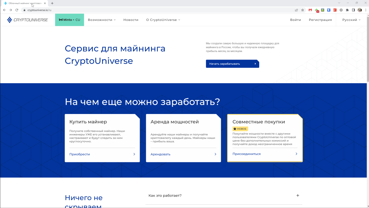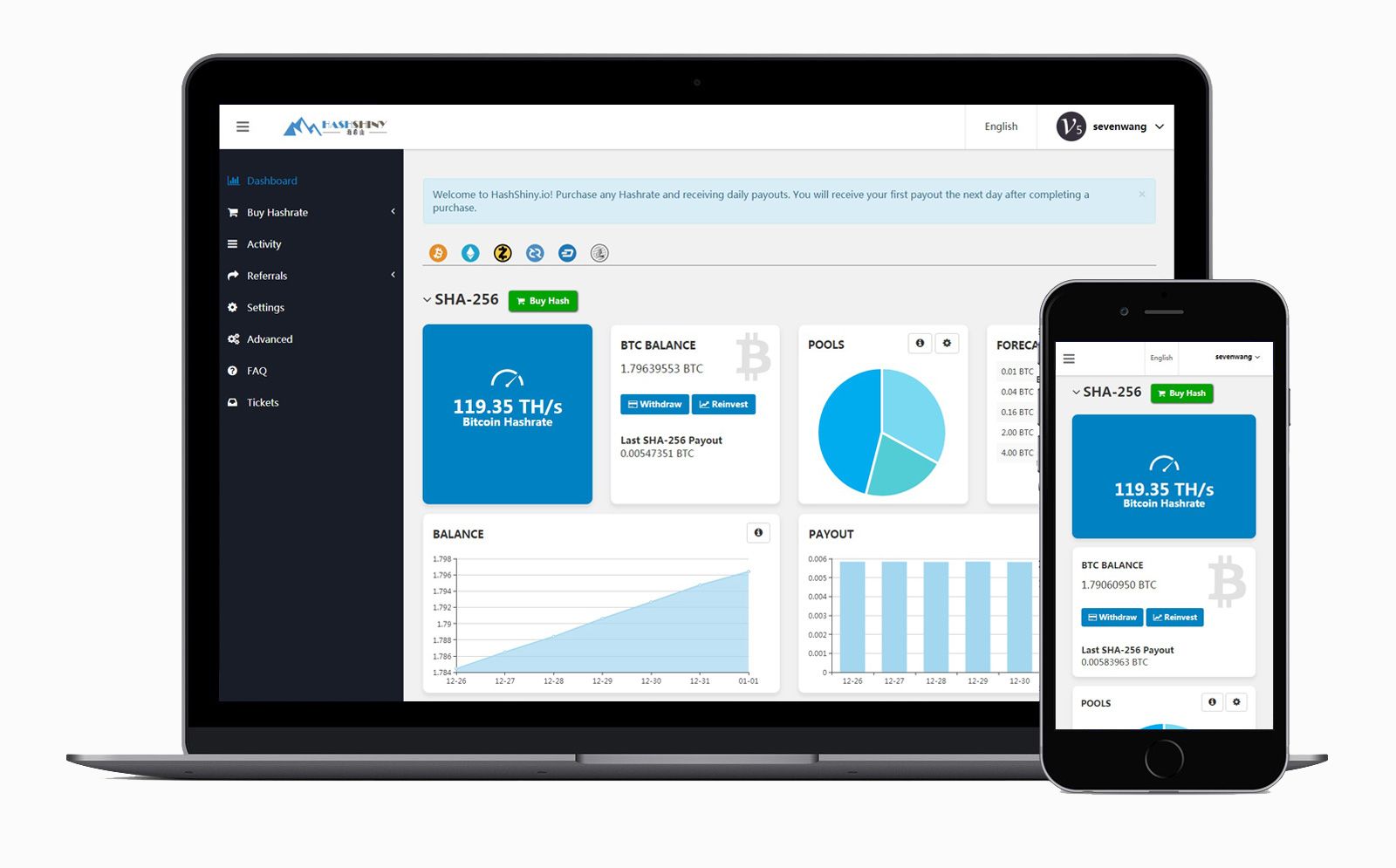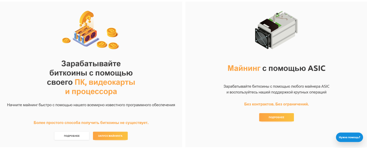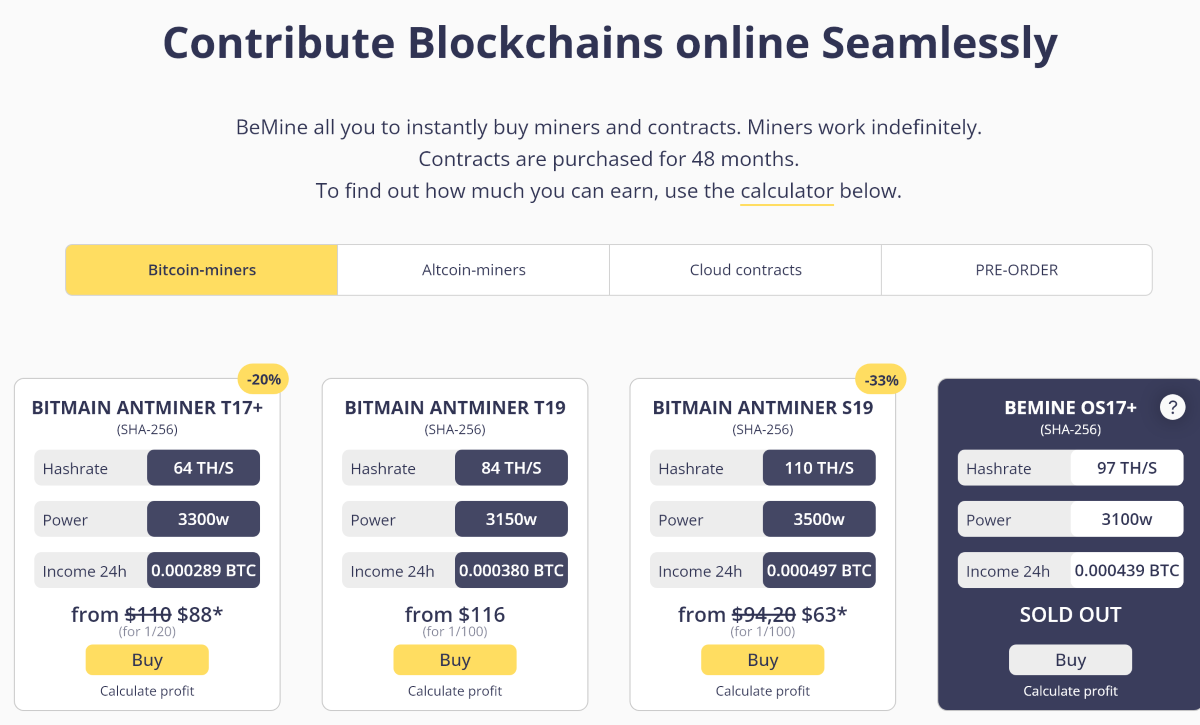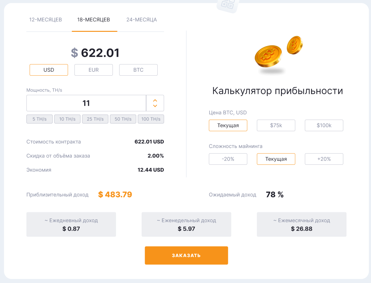 На этом сайте можно не только оплатить контракт, но и приобрести непосредственно оборудование. Можно оплатить целый майнер или его определённую часть — до 1/100. В первый же день после внесения средств клиент начнёт получать доход.