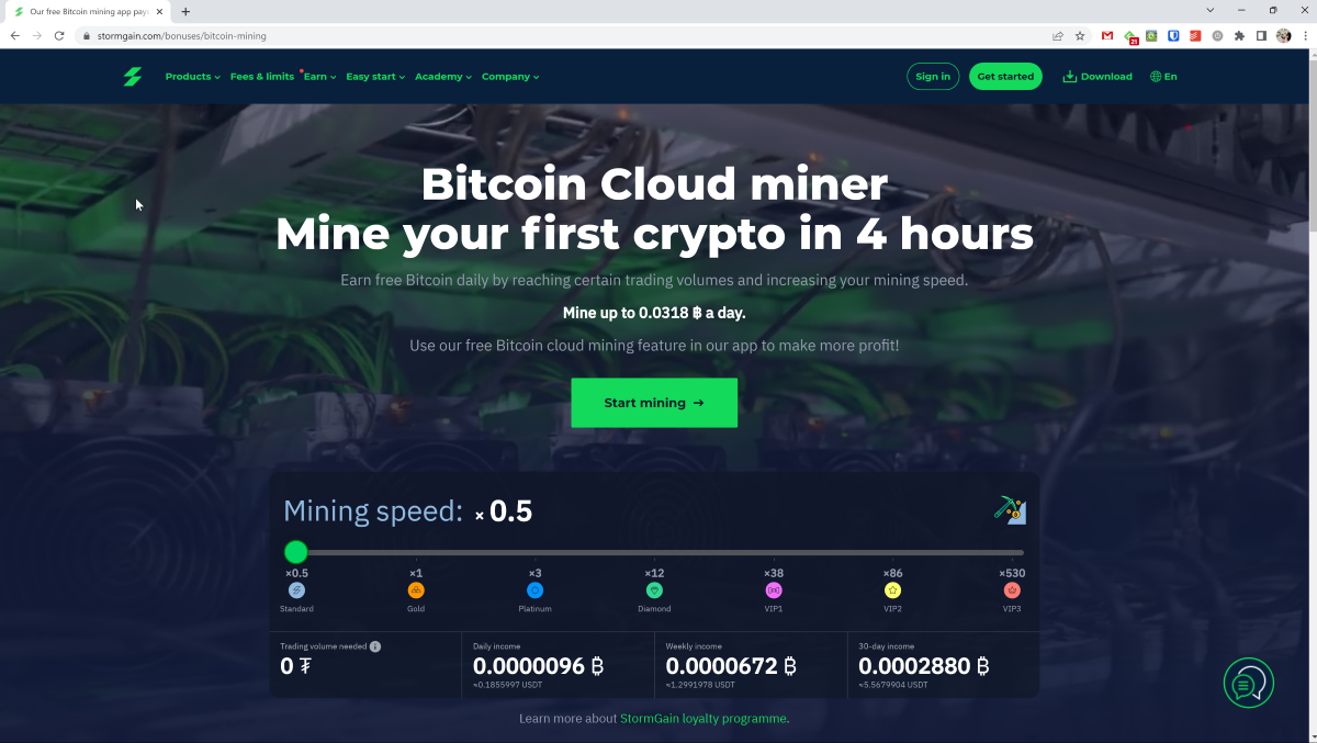 Сервис в чём-то схож с бонусной программой. Каждый день пользователь получает криптовалюту, размер которой зависит от статуса, на который в свою очередь влияет объём торговли. Компания обеспечивает майнинг на личном оборудовании StormGain. Установка приложений на своём ПК не нужна — достаточно нажать на соответствующую опцию в личном кабинете после регистрации. Ежемесячный доход — от $12 до $12 000.