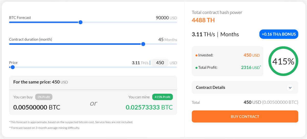 Сайт предлагает удобные настройки по приобретаемым контрактам. При выборе пользователь может автоматически рассчитать будущий доход. Есть разные варианты оплаты — например BTC, ETH, LTC или USDT, карта. Поступление дохода происходит в режиме онлайн. Для отслеживания начисления прибыли нужно авторизоваться в личном пользовательском кабинете.
