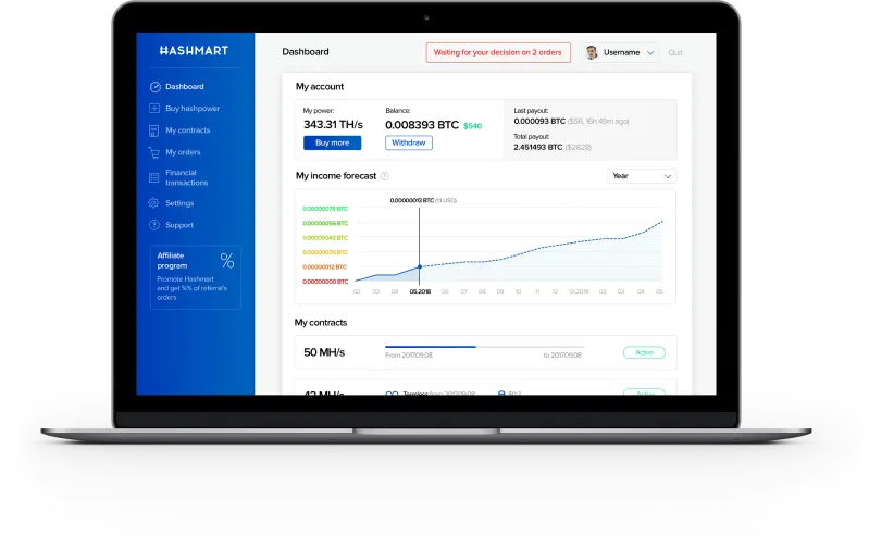 В личном пользовательском кабинете клиент может ознакомиться со статистикой по прибыли, операциям, мощности. Предусмотрена опция автопрогнозирования доходов.