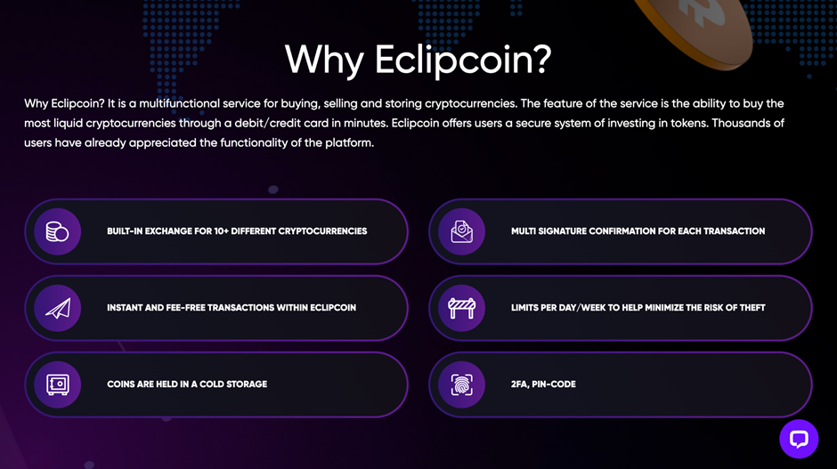 Eclipcoin - один из самых запоминающихся криптовалютных кошельков. Он был создан в 2020 году, но за короткое время смог увеличить свою функциональность и добавить новые криптовалюты для обмена. Эта криптовалютная платформа стремится повысить уровень безопасности для своих клиентов. Что заслуживает похвалы. Ведь кошельки защищены от взлома, а многоуровневая система авторизации исключает ошибку.