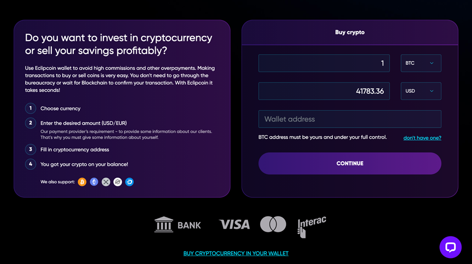 Отметим, что у Eclipcoin есть удобный обмен криптовалюты на фиатные деньги. Вы можете покупать и продавать криптовалюты из своего кошелька через дебетовые карты VISA или MasterCard. Еще одним преимуществом Eclipcoin перед другими обменниками является возможность покупки криптовалюты с помощью банковского перевода, в частности, кошелек обеспечивает переводы SEPA и SWIFT.