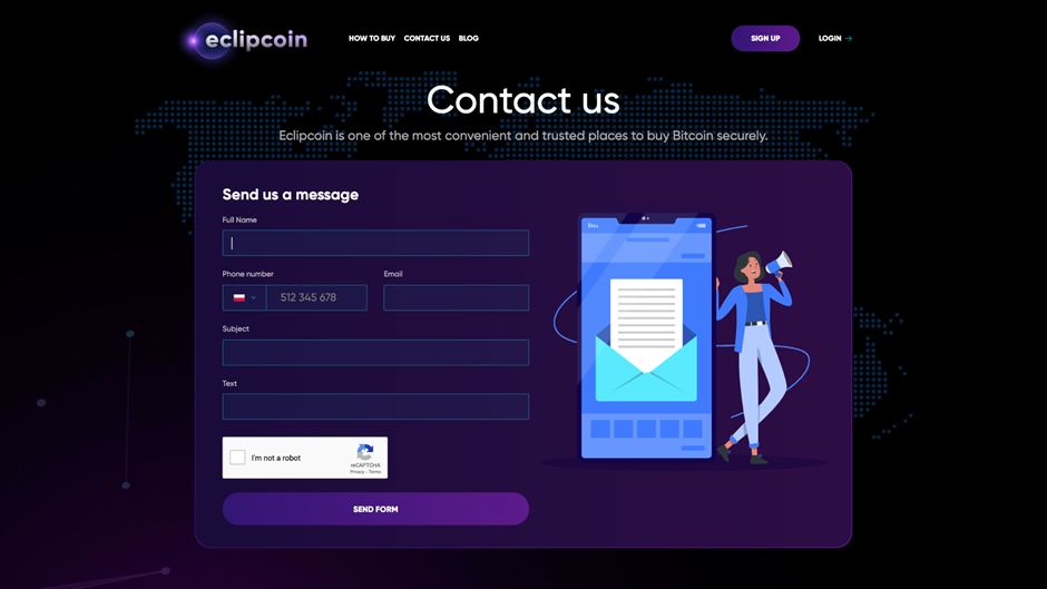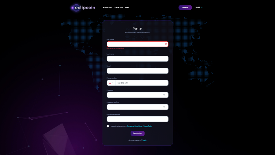Чтобы приобрести или обменять криптовалюту, необходимо создать учетную запись на платформе. На главной странице сайта вам нужно перейти на страницу регистрации и указать свою контактную информацию. Обратите внимание, что у Eclipcoin есть политика конфиденциальности. Данные пользователей не передаются третьим лицам и не используются в коммерческих целях.