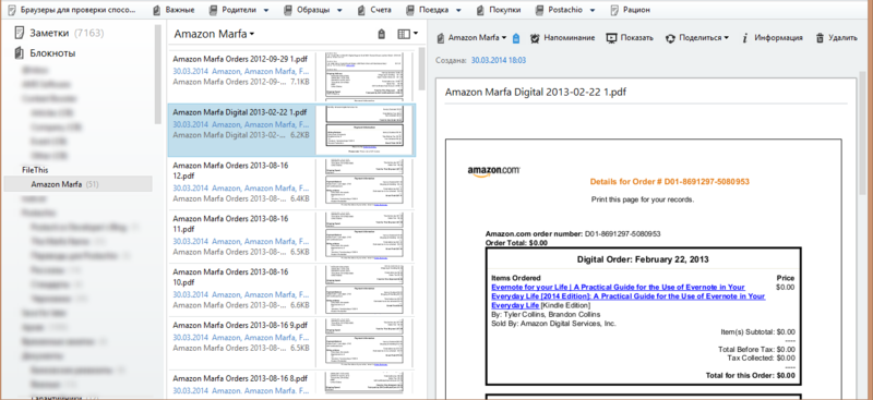 И все готово! Вот мои блокноты Evernote, куда автоматически приходят все счета от Amazon: