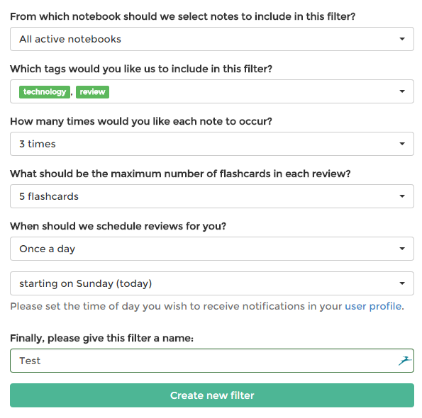 Жмем Setup new filter и указываем сервису фильтр для заметок, которые мы хотим запомнить. Вы можете указать определенный блокнот или все заметки. Так же вам нужно указать теги. Ниже вы указываете сколько раз каждая заметка может повторяться. Лучше указать число побольше, чтобы точно запомнить заметку. Дальше вы указываете количество карточек, которые вам будут показаны. А еще ниже вы указываете с какого дня и сколько раз в день вы хотите обучаться.