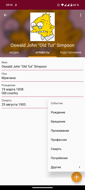 А в самой карточке родственника можно хранить его фотографии, добавлять самую различную информацию и родственников.