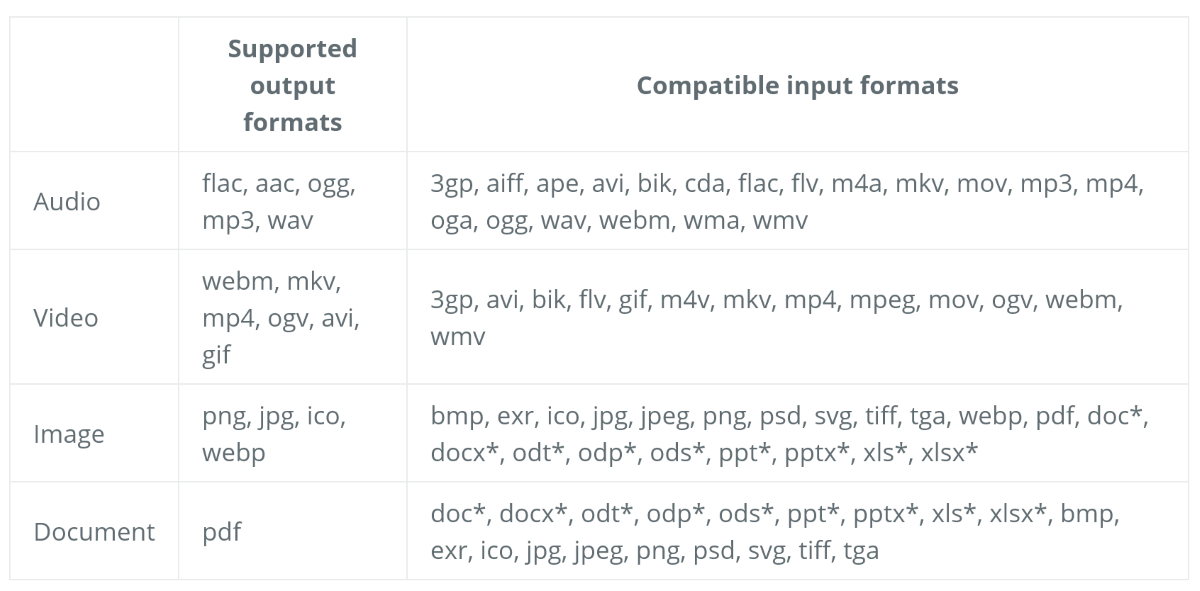 Список форматов зависит от исходного файла. Вот список поддерживаемых форматов.