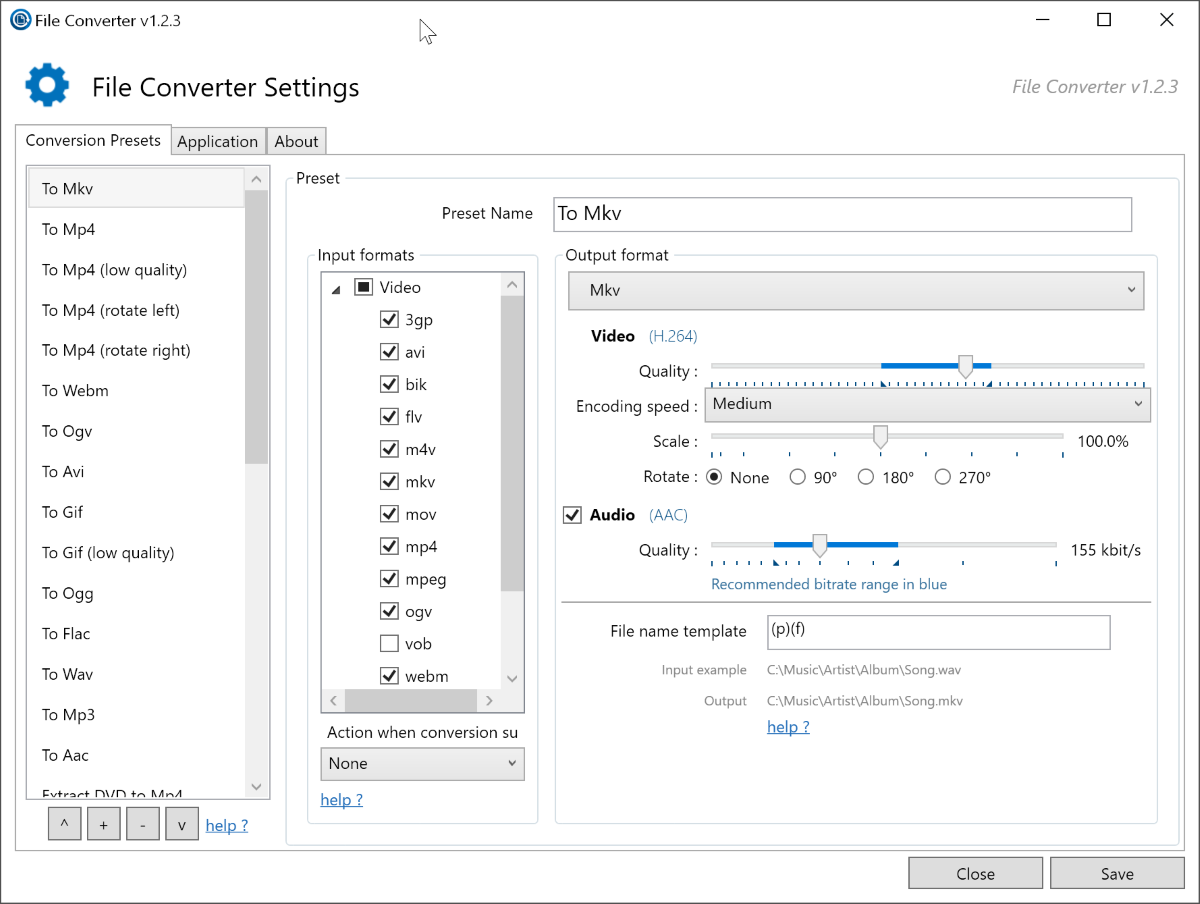 В настройках File Converter можно отключить лишние форматы, для каждого формата выбрать параметры, а также указать действия после конвертации.