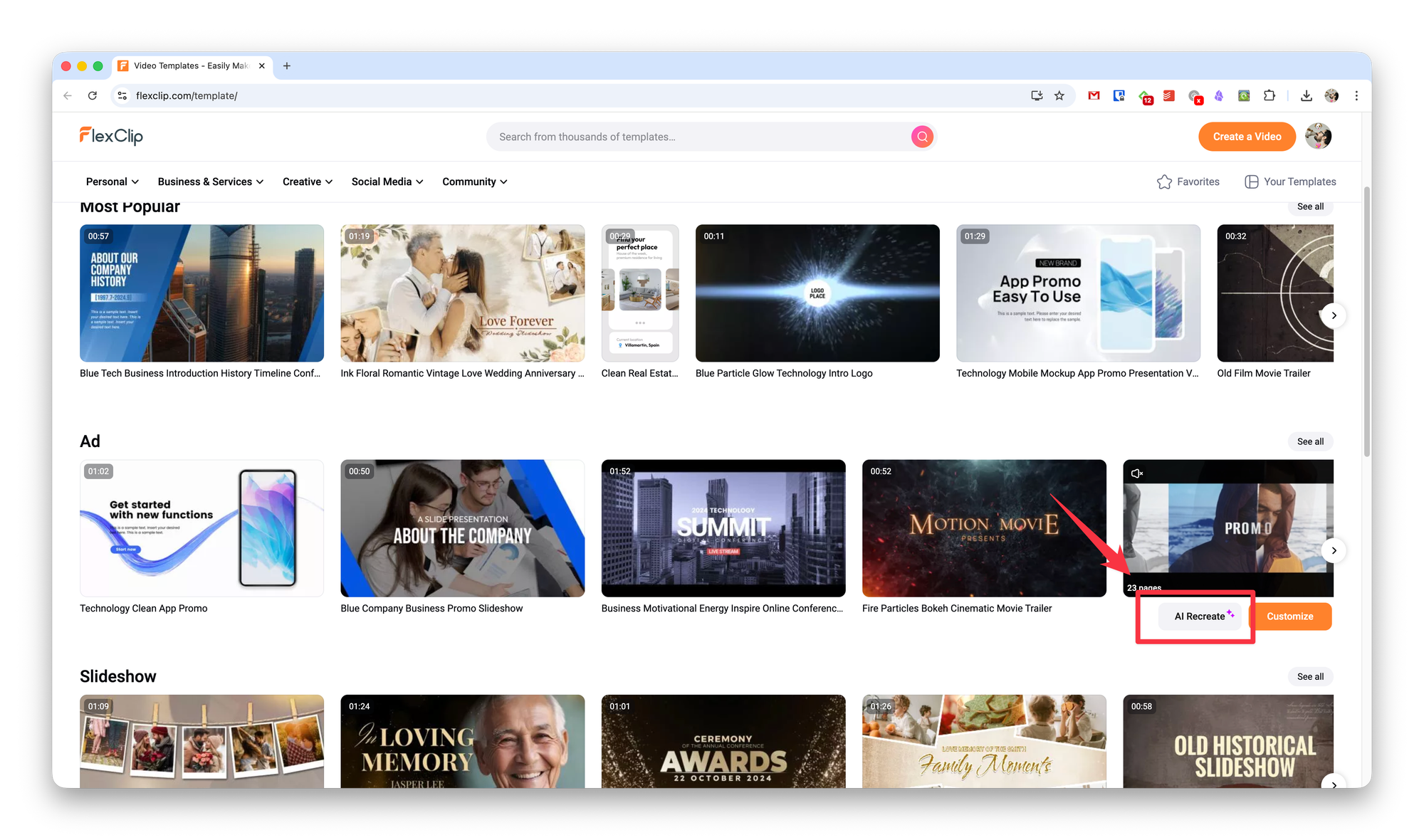 Для этого в разделе шаблонов нужно найти подходящий под вашу задачу и нажать кнопку AI Recreate.