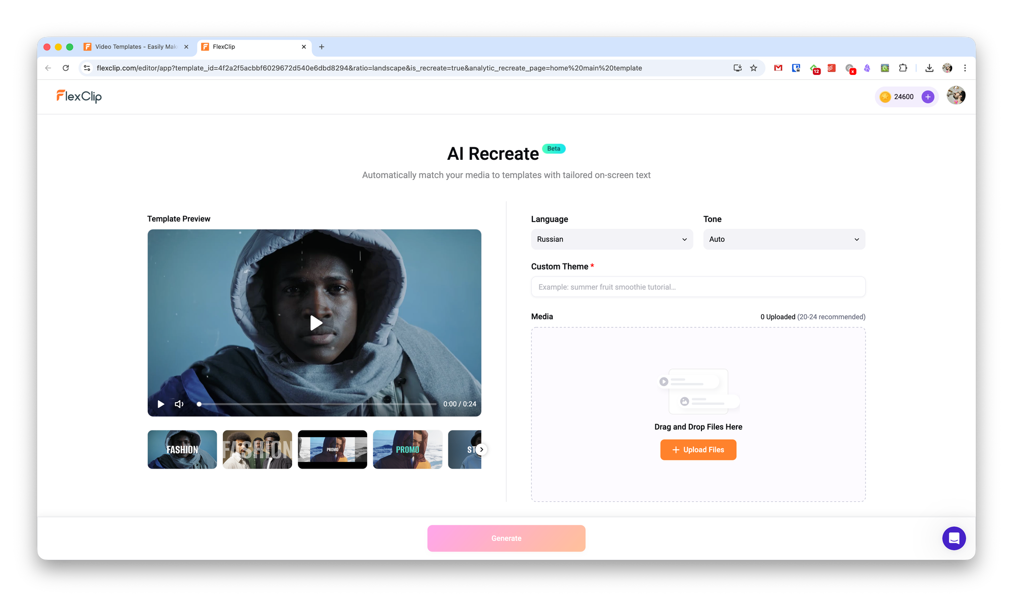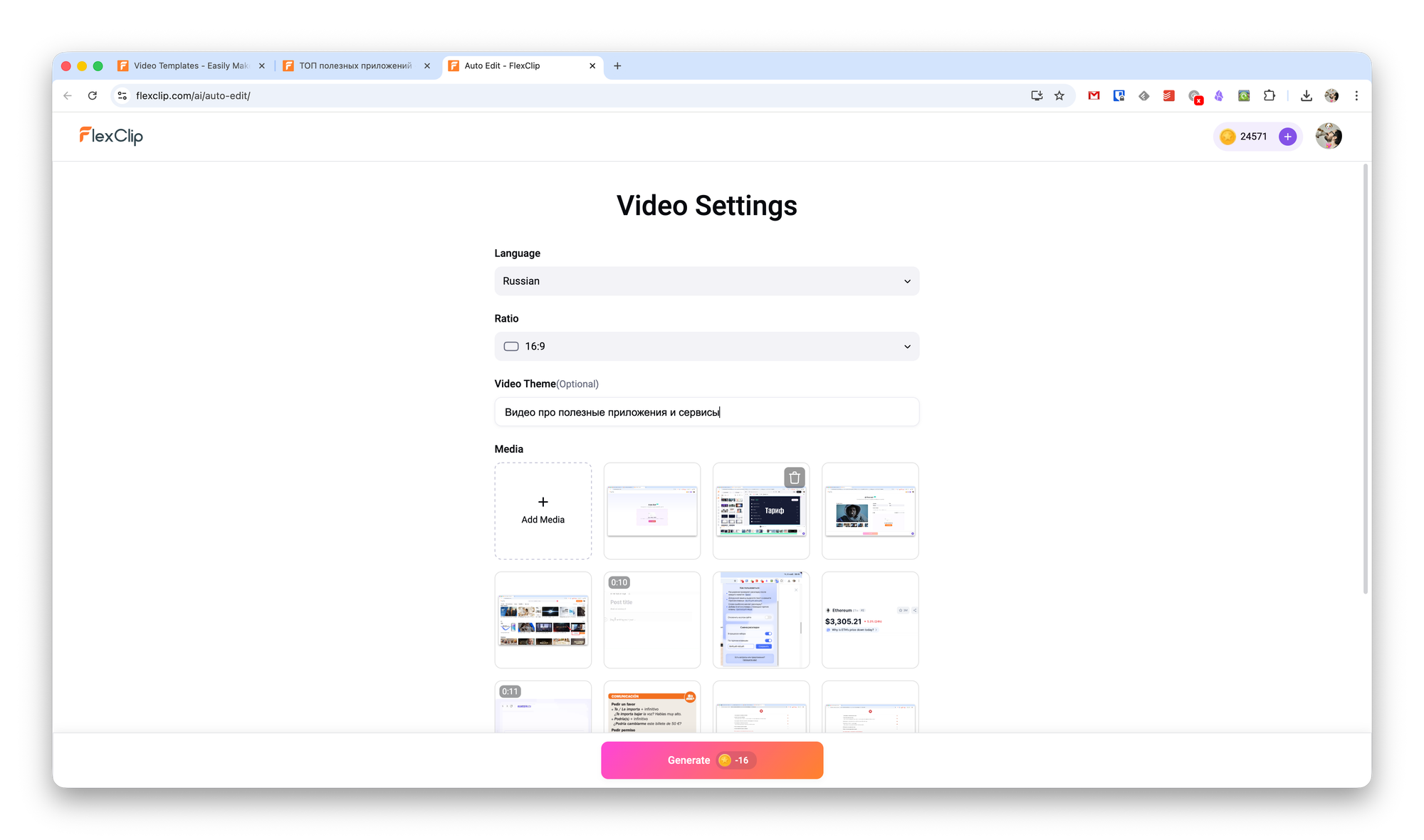 Далее нужно задать тему видео. Это может быть простое текстовое описание, на основе которого сервис сгенерирует видеоряд. Также нужно загрузить видео и фото, которые хотите включить в будущий проект. Для корректной работы рекомендуется добавить около 20-24 файлов.