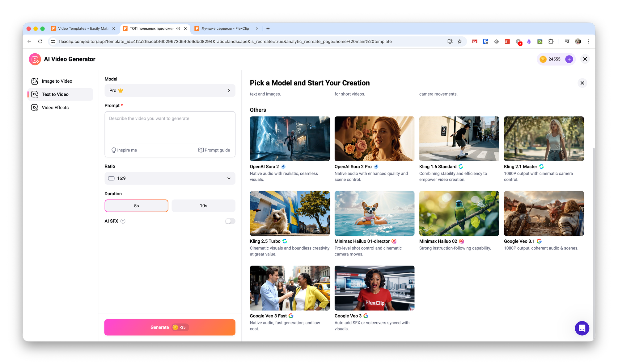 Также во FlexClip в целом прокачали создание видео по текстовому описанию. Теперь при генерации таких видео вы можете выбрать одну из нейромоделей: Kling 2.5 Turbo, Sora 2, Sora 2 Pro, Google Veo 3 Fast и Google Veo 3.1.