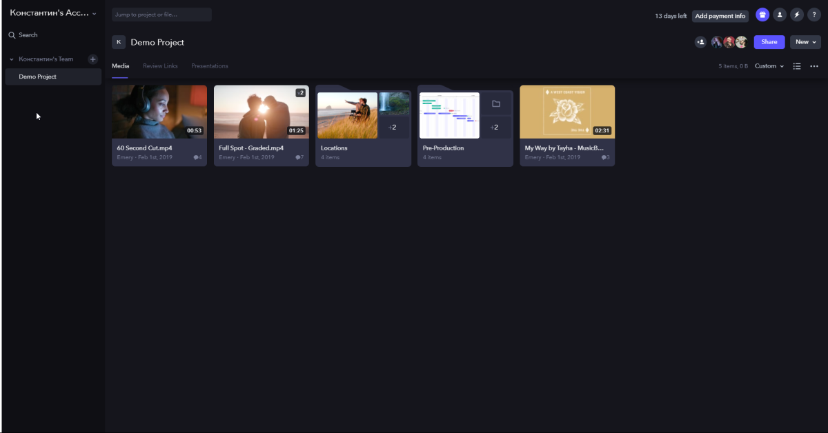 Работать с сервисом можно только с помощью браузерной версии или приложения для iOS. Стартовое окно Frame.io предоставляет удобный доступ к проектам вашей команды с возможностью быстрого переключения между ними.