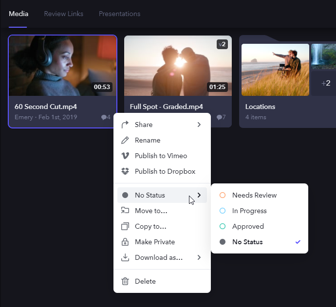 Видео внутри проектов можно хранить в папках. При наведении курсора на превью появляется возможность быстрого предпросмотра с перемоткой. А в контекстном меню файла или папки можно выбрать одно из быстрых действий: «Поделиться», «Переименовать», «Загрузить в облачный сервис», «Указать статус работы», «Переместить», «Скачать», «Удалить».